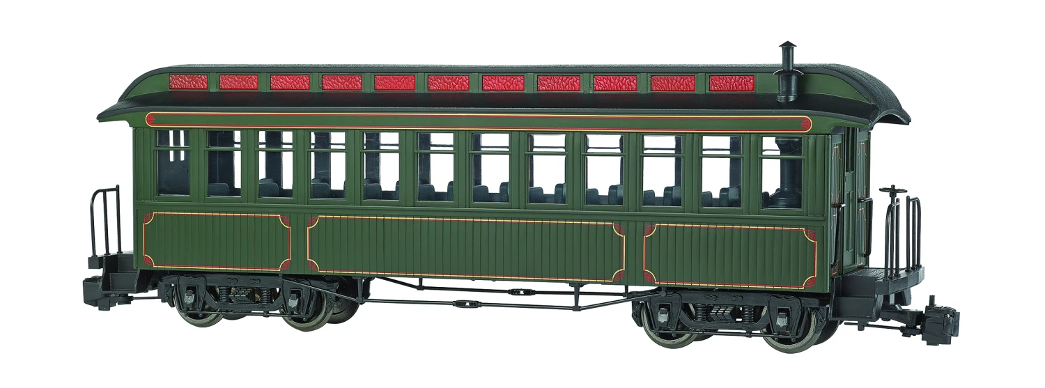 This classic passenger car features track-powered interior lighting, metal handrails, and metal wheels.