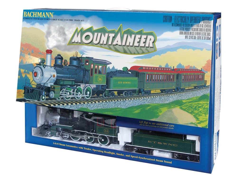 Beginning construction in the mountains of post-Civil War Tennessee, the East Tennessee and Western North Carolina Railroad Company was known locally as the āEat Taters and Wear No Clothesā railroad. Narrow gauge operations began in 1881, and after nearly 60 years of operation, developing interstate highway systems and the torrential rains of 1940 worked to bring about the railroadās demise. Following a series of purchases and acquisitions (singing cowboy Gene Autry once owned an ET & WNC locomotive), the railroad was resurrected in 1956, going on to become one of North Carolinaās favorite travel attractions. Our Mountaineer passenger set comes complete with a 4-6-0 steam locomotive (with operating headlight, smoke, and speed-synchronized sound), coal tender, coach with lighted interior, and observation car with lighted interior. The set also includes an 8’2″ x 4’3″ oval of track (20 pieces), power pack and speed controller, illustrated āBach Manā instruction manual, and DVD format video instructions.