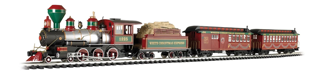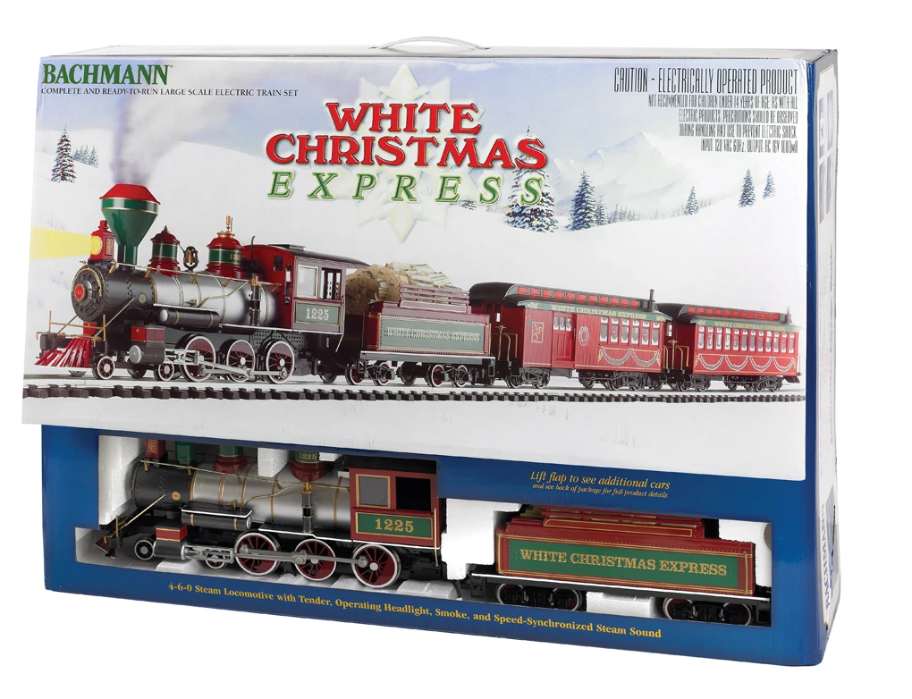 Create a festive scene under your tree with this colorful Yuletide set. With a full head of steam in the boiler, your passengers will be transported on a magical holiday adventure aboard the White Christmas® Express. The White Christmas® Express comes complete with a 4-6-0 steam locomotive (with operating headlight, smoke and speed synchronized sound), tender with wood load, combine with operating door and lighted interior, coach car with lighted interior, 8’2″ x 4’3″ oval of track (20 pieces), power pack and speed controller, illustrated “Bach Man” instruction manual, and DVD format video instructions.