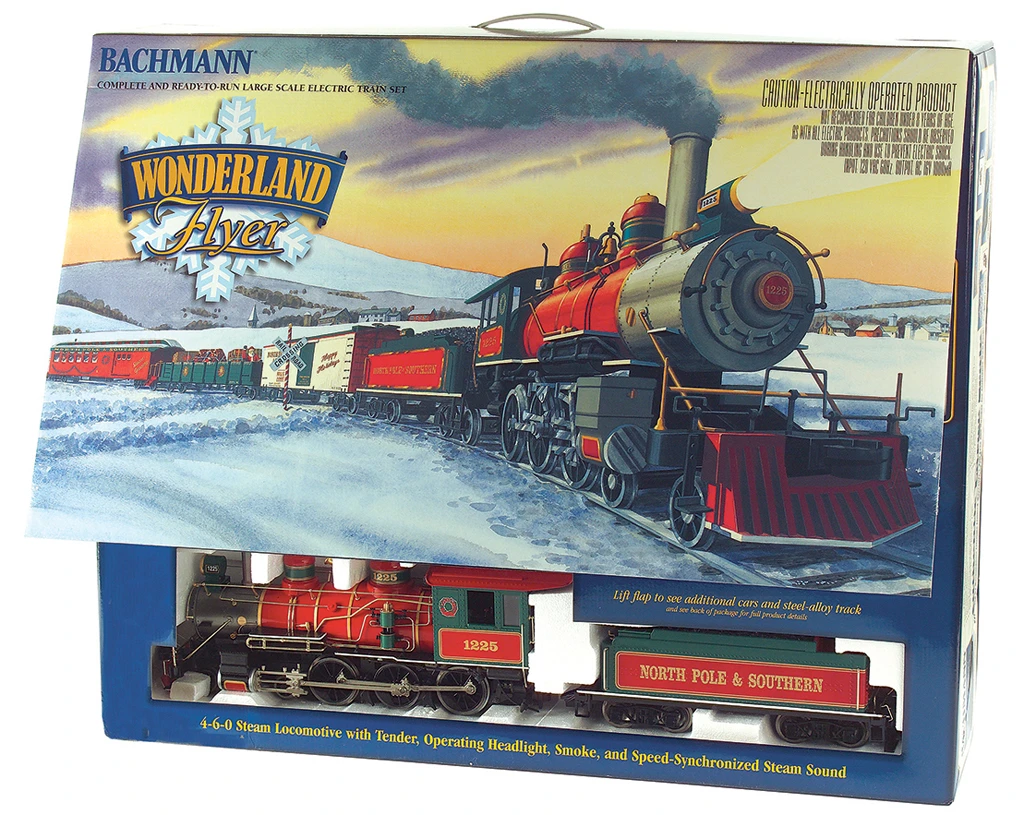 From end to end, this freight train set is brimming with holiday railroading fun! The limited edition Wonderland Flyer features an Anniversary Edition 4-6-0 steam locomotive (with operating headlight, realistic smoke, speed-synchronized steam sound, metal wheels, siderods, and detail parts), coal tender, box car, gondola with presents, combine with operating door and lighted interior, candystripe crossbucks, Santa figure, 32 running feet of track that builds up to a giant 12Ā“ x 6Ā“ oval, power pack and speed controller with plug-in wiring, and DVD format video instructions.