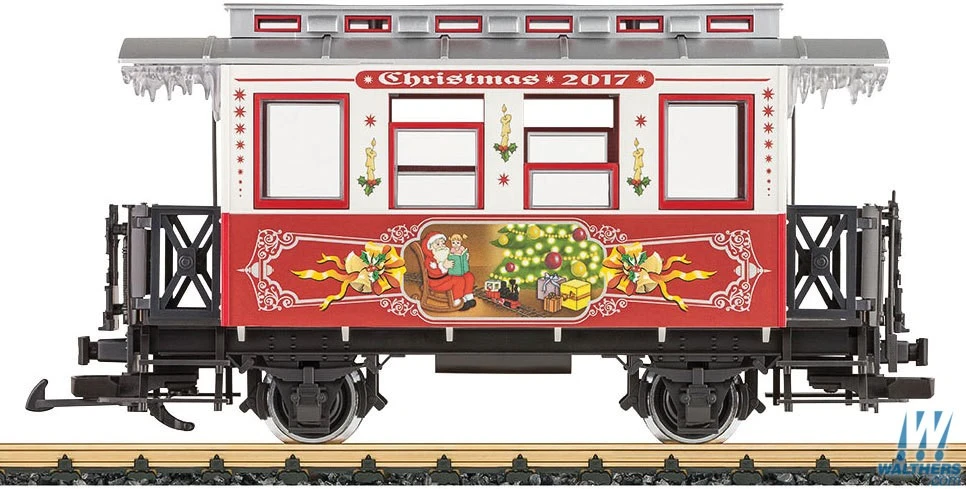 This LGB Wooden 2-Axle Passenger Car with Music is decorated in a festive holiday scheme for Christmas 2017. It features detailed paint and lettering, opening doors, full interior, metal wheels and European-style hook-and-loop couplers. The car also plays four different Christmas songs. It requires four AAA batteries (not included). It’s a great addition to you G Scale collection of Christmas cars.